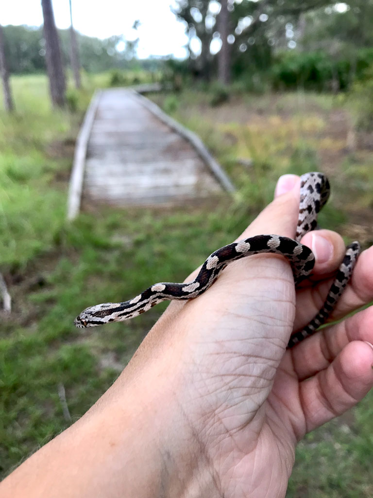 We released the snakes just off the boardwalk trail near the freshwater marsh. Many pictures were taken and tears shed. They grow up so fast. We even witnessed a little predator-prey action as a hungry black racer whipped out of a nearby saw palmetto, enticed by the baby snake buffet we had laid before him. We chased him off, but that would be the last time weโd be able to protect our babies. They were on their own now.