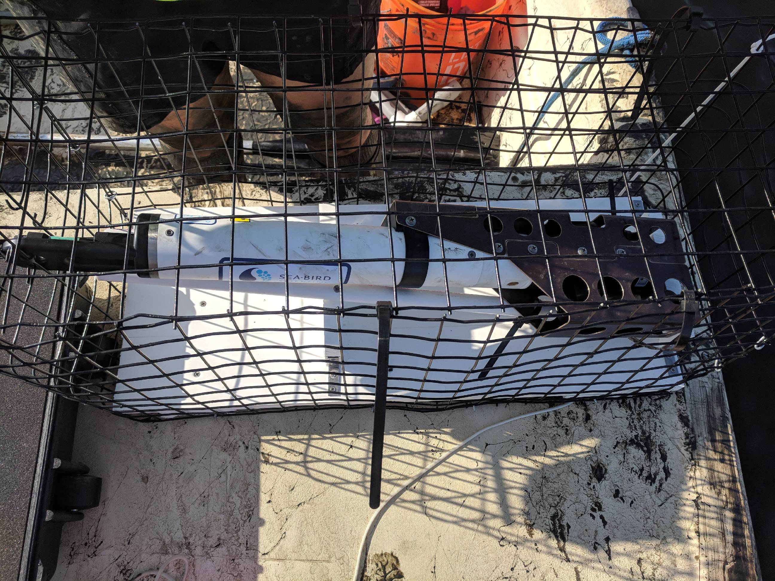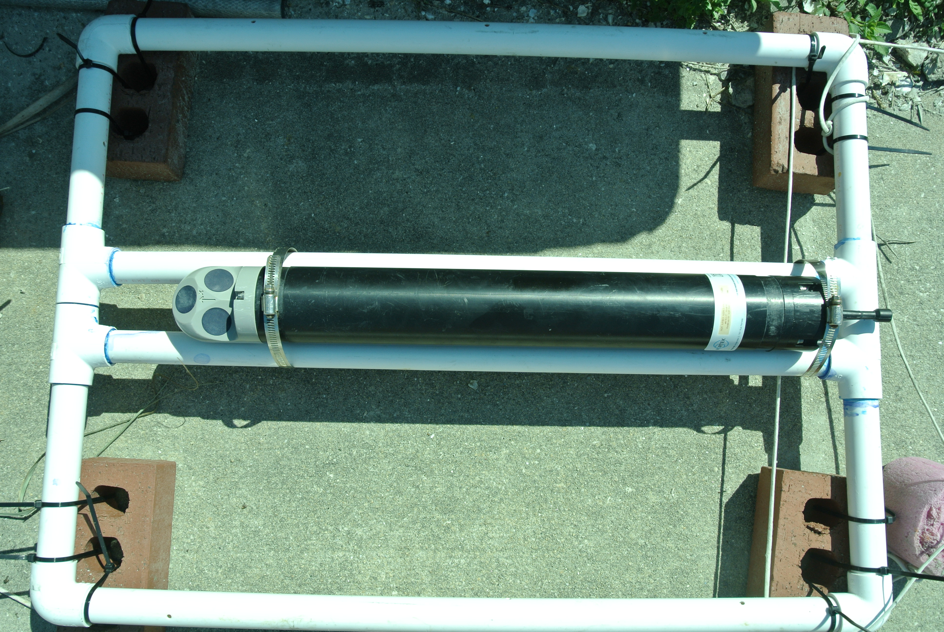 The last instrument we put out is an ADCP to measure the flow of the water. ADCP stands for “acoustic doppler current profiler”, and the instrument uses the Doppler Effect to measure the velocity at which water is passing the instrument. It emits a sound and measures the echo of the sound back to the instrument to determine how quickly the water is moving.