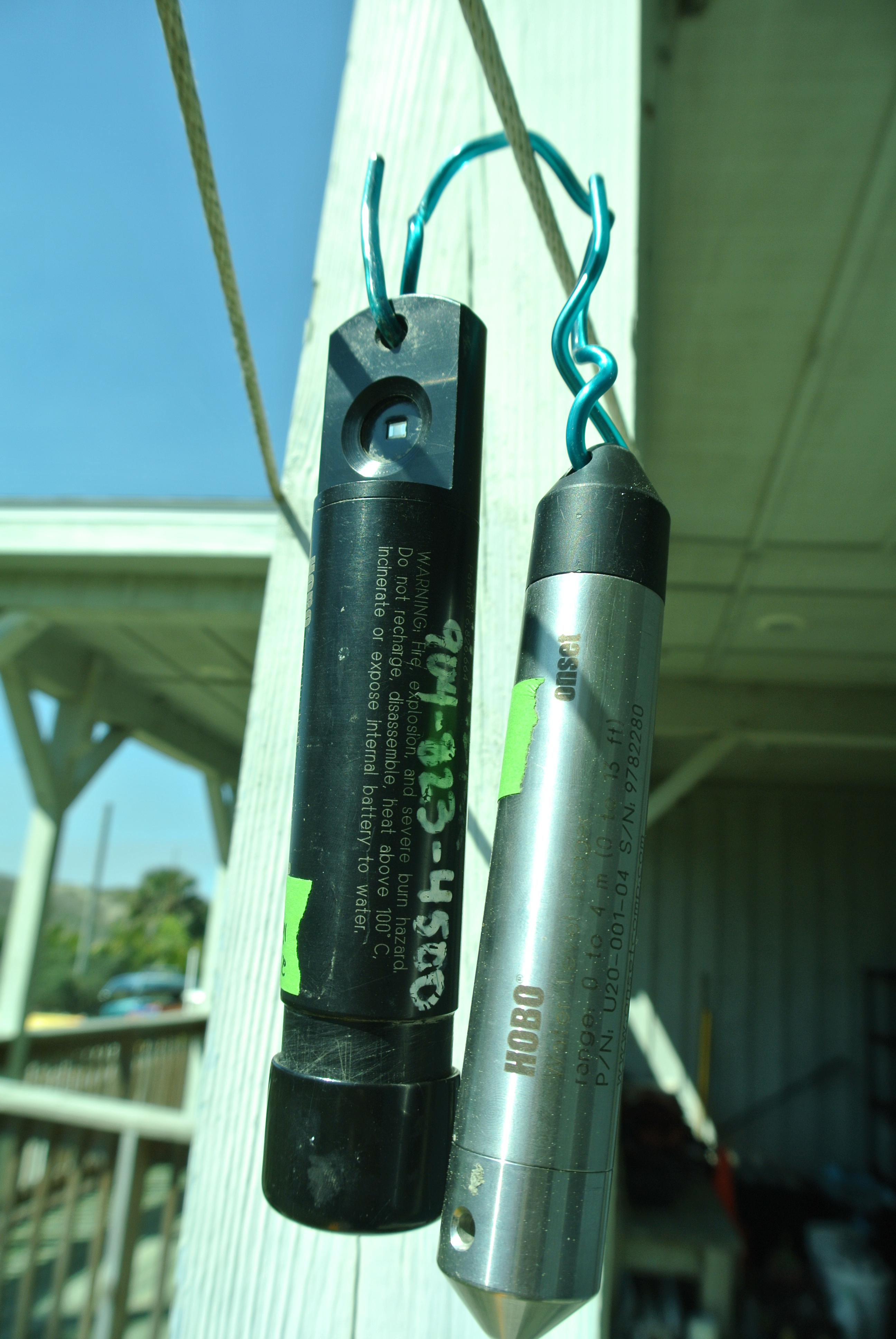 The two loggers with the salinity logger on the right and the tidal logger on the left