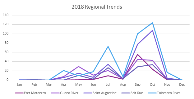 In 2018, you can see that spat settlement didn’t really start to kick off until around April. As we’ve noticed analyzing past years, we experience two peaks- a smaller rise mid-year, and then a larger one as the year comes to an end. Notice that, while not entirely uniform, each reef holds a similar pattern as far as the highs and lows of spat settlement.