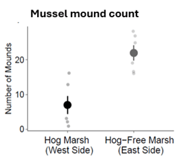 As mussels are a foundation species that provide important connections throughout the whole marsh ecosystem, we hypothesized that the reduction in mussel populations would have cascading effects to the entire marsh community. While not part of my initial PhD plan, this hog study seemed like an essential first step. How could we assess mussels as a nutrient remediation tool without understanding why the mussel populations were reduced in some areas?