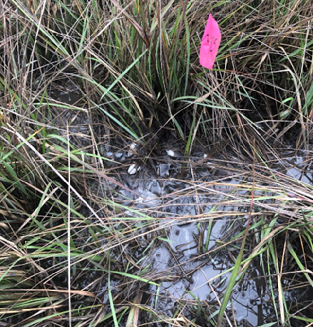 We suspect that hogs are active in the western marsh because that site is bordered by a hardwood hammock forest within a wildlife management area, while the eastern marshes are bordered by houses, a narrow dune, and highway A1A. Hog presence led to trampled marsh cordgrass, and a reduction in marsh crabs, marsh elevation, and sediment accretion, all of which are detrimental impacts to marsh functioning. But, we also noticed that in untrampled areas at hog-accessed locations, cordgrass was taller than in hog-free marshes, likely due to the release of nutrients from trampled grasses. And, hog trampling stimulated sediment denitrification, leading to permanent removal of nitrogen from the system. Hog management has been an ongoing discussion in the GTMNERR and throughout the Southeast US for decades, and our findings revealed many negative impacts of hogs in salt marshes, but also some surprising positive effects.